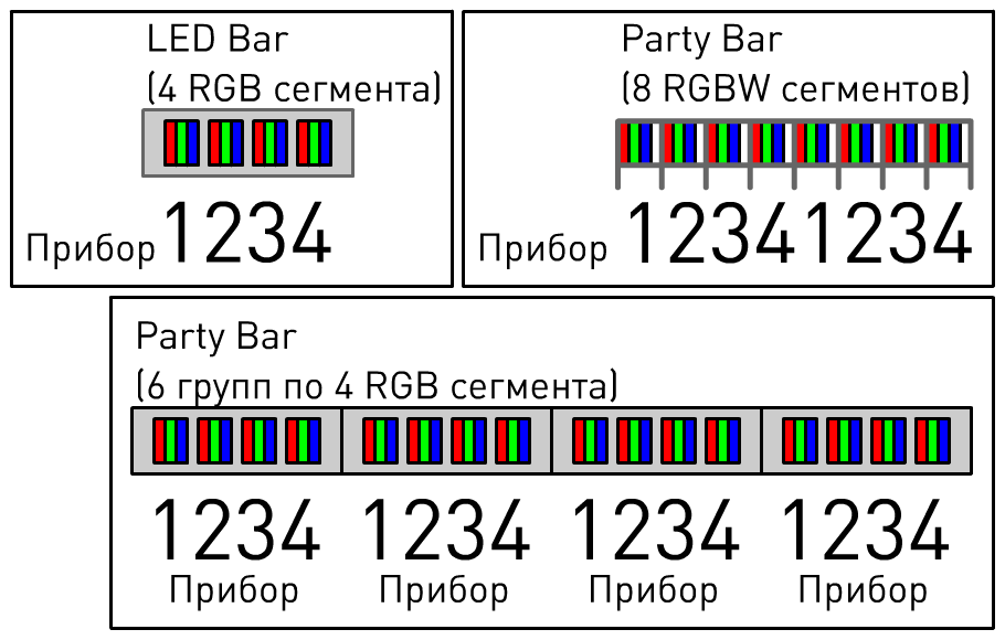 "LED Bar (4 RGB сегмента)" - предназначено для управления прибором LED BAR, состоящим из 4 групп RGB каналов, которые располагаются подряд. Номера каналов первого светильника из группы задается в каналах Красный, Зеленый и Синий редактора патчей. Данный режим рассчитан на 4 световых прибора с разными адресами (333, 349, 365, 381) таким образом рисунок, набранный в редакторе для LED PAR будет располагаться и переливаться между 4 световыми сегментами."Party Bar (6 групп по 4 RGB сегмента)" - рассчитан на управление PartyBar/Led Bar/Pixel Bar, в котором 6 групп по 4 RGB сегмента, с располагающимися подряд каналами RGB. Номера каналов первого сегмента из группы задается в каналах Красный, Зеленый и Синий редактора патчей. Каждый RGB сегмент светового прибора считается отдельным прибором, таким образом рисунок набранный в редакторе для LED PAR красиво рисуется на одном световом приборе.